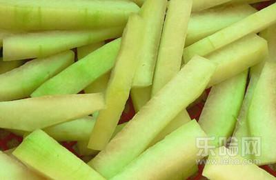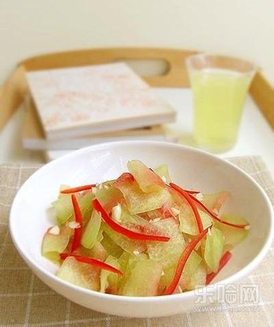 材料:西瓜皮300克,葱2条,盐、红辣椒、味精各适量。做法:去掉西瓜的红瓤和外层硬皮,将瓜皮切成细条,撒盐腌着。再把西瓜皮挤干水分。红辣椒切丝,放少许盐在油锅中炸一下,再倒进西瓜皮炒2分钟,然后放味精、小葱,翻炒几下就可以起锅了。