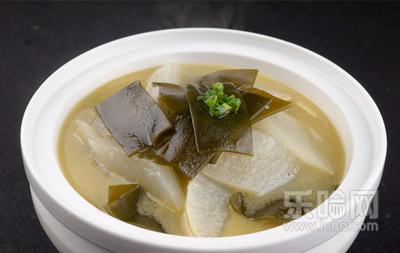 海带100克、萝卜1个约300克。桂花、姜、山楂各适量。做法:①把萝卜削皮切成小块,用1500毫升水,以大火煮沸后放萝卜、海带、姜片。②待水再度滚时转成小火,直到萝卜、海带煮熟烂,最后加入用纱布包着的其他药材,再煮15分钟即可。