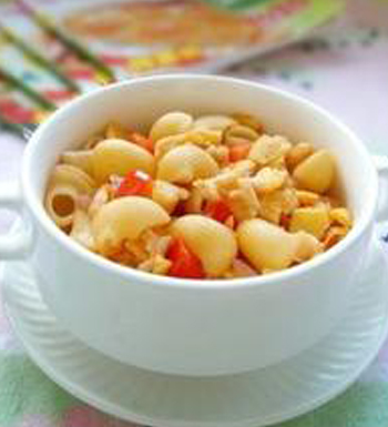 制作方法:烧开一锅水,下入通心粉,通心粉煮熟后倒在冷开水中过一遍水,捞出沥干水分。苹果和胡萝卜洗净切成小丁,花椰菜和青豆要用开水烫一下,要烫熟。洋葱切成丝下入油锅中炒香,之后加入准备好的肉末,翻炒熟后下入以上所有备用食材,翻炒拌匀即可。